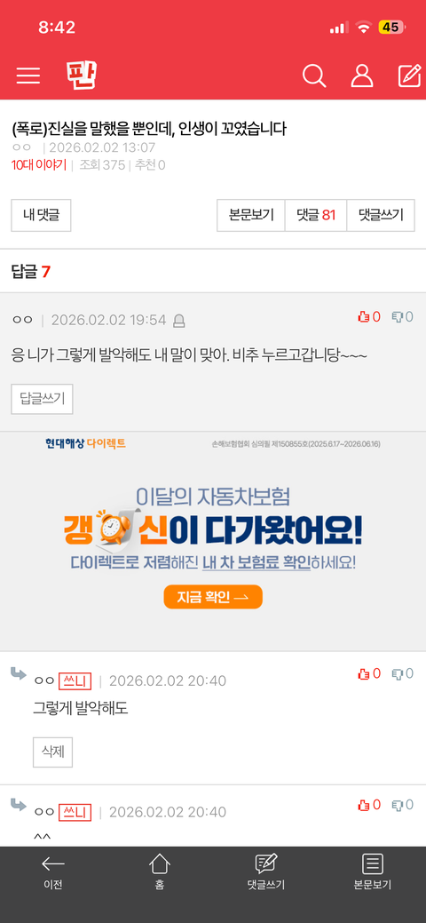 윤석열 체포 실패 뉴스를 보고 네이트판에 다시 접속했어 아침에 쓴 글을 확인했지