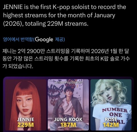 1월 k팝 솔로 스포티파이 스트리밍 수 1위