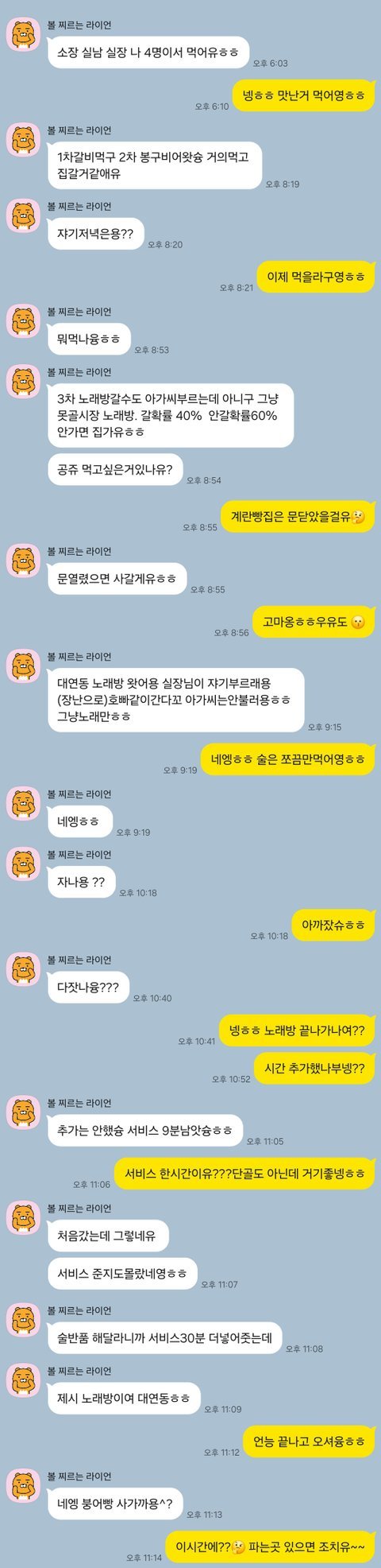 예랑과 대화해본 예랑입장 >> 원래 아가씨부르는 노래방인데 안부르고 논다고 얘기했다고 하는입장(여자분이 같이계셔서 안부른거는 확실)/ 그렇게 불안하면 같이 가지 그렇냐 앞으로 문제안생기게 그냥 같이가자, 니친구들만날때도 어떤심정인지 똑같이 시간에 집착해줄게 조심해라 등등 기억나는게 이거네요