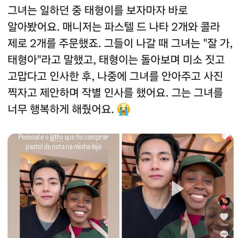 방탄 지금 리스본에 있음 뷔가 카페에서 메뉴 주문했는데 아미가 일하던 가게였음 아미가 주문할때는 모르는척 하고 나갈때 잘가 태형아 이렇게 인사했는데 뷔가 안아주고 같이 사진찍어줄까? 먼저 물어보고 사진도 찍어줬대 근데 사진 AI인줄 알았음