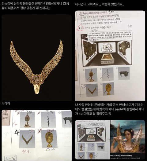 오늘 한능검 문제 제니 zen 뮤비에 나온 신라 금관 의상이 생각나서 맞혔다는 사람들 속출하는 중