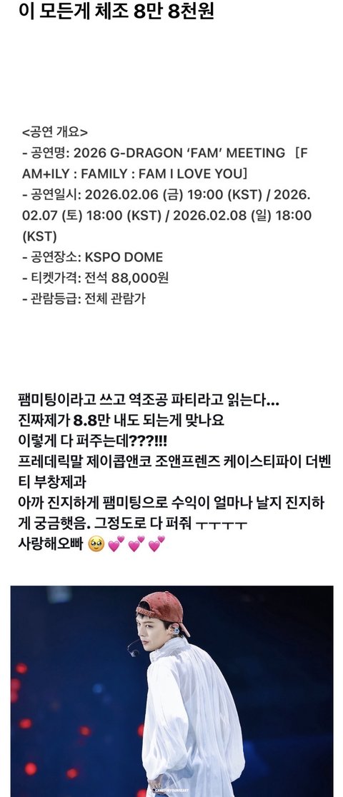 근데 지리긴한다 국내에서만 12만콘하고 한달만에 3.5만팬미팅하는 연예인이 어딨냐 아니걍 원기옥으로도 아무도 이정도 팬미팅 혼자못하는게 팩트임ㅋㅋㅋㅋㅋㅋㅋㅋㅋㅋㅋ 지디정병들은 현실이나 인스타 어딜봐도 갓반인들이 지디빨고있어서 개빡칠텐데 지디가 팬들을 너무 사랑하고 우리끼리 행복해보이니까 정신병와서 손벌벌떨릴만해
