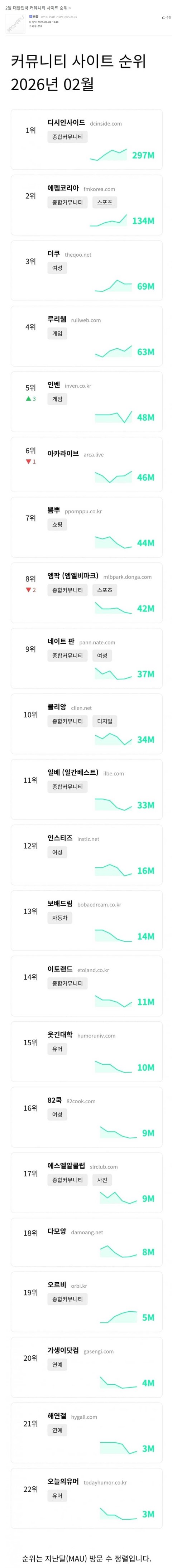 2월 대한민국 커뮤니티 사이트 순위