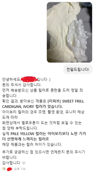 리퍼브 세일로 아이보리 가디건을 샀는데, 다른 색이 배송된 것 같아요ㅠ