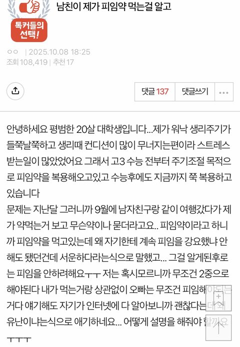 남자친구한테 피임약을 들켰는데요