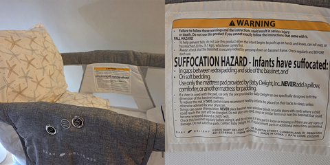 질식위험 – 실제 질식 사고가 발생했습니다. 절대 베개를 추가하지 마시오