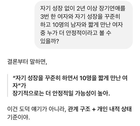 반면 장기연애를 했어도 남자에게 정서적 의존도가 높은 여자라면 관계를 장기적인 관점으로 본다는 장점이 사라짐. 그냥 무능해서 붙어있었다 이렇게 밖에 안보임.