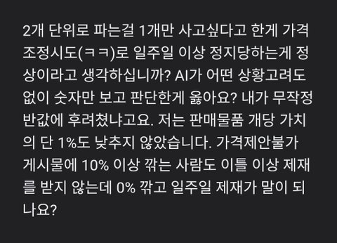 별건 아니고 2개씩 묶어파는 물건 1개만 구매할 수 있냐 물었더니 곧바로 당근알림 날라오고 일주일 정지당함
