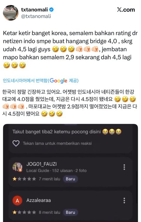 화나서 한강대교, 마포대교에 별점테러하는 트윗 좋아요가6천을 넘음 돈 안 드는 짓은 다 하네