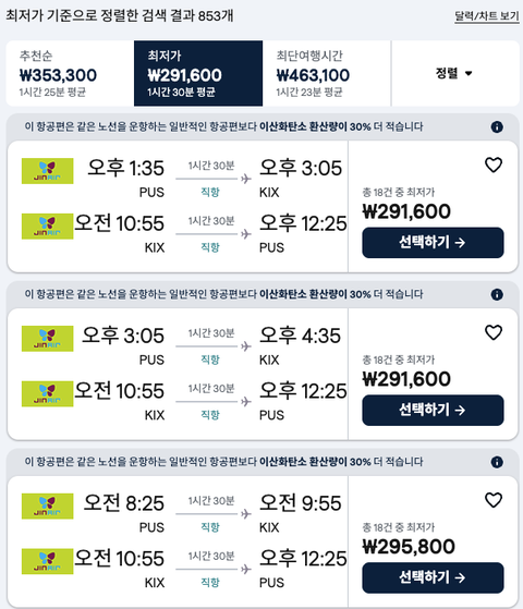 스카이스캐너로 검색하면 최저가가 29만원대부터 시작