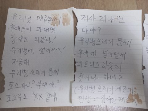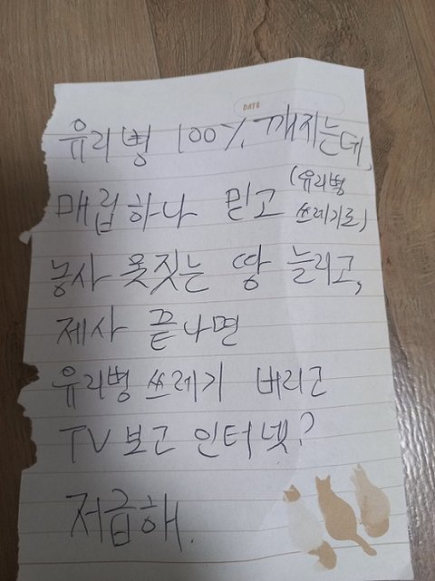 제사지내면서 일회용유리병이 나오는 술 마시는 사람 보면 일회용유리병쓰레기같아서 ' 후대가 농사지을 땅을 없애면서 제사지내나? ' 하는 기분이 들어서, 새해에도 희망은 없음...