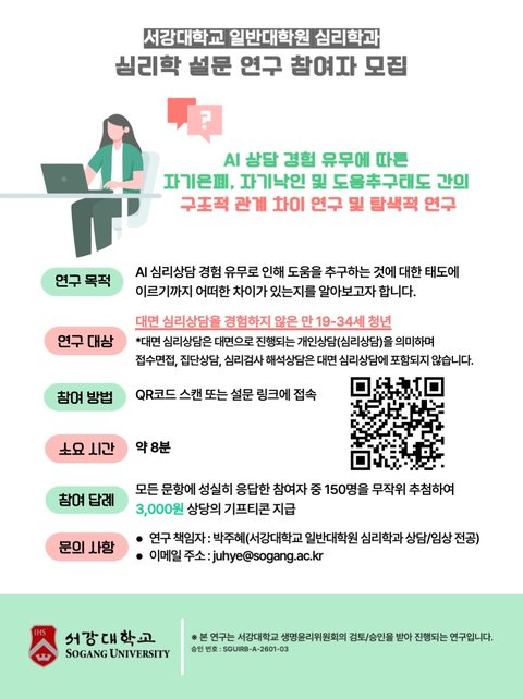 현재 석사학위논문을 위한 연구로 AI 상담 경험 유무에 따른 자기은폐, 자기낙인 및 도움추구태도 간의 구조적 관계 차이 연구를 주제로 설문조사를 실시하고 있습니다.