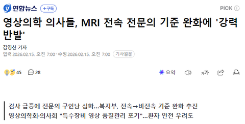 이 뉴스 보셨나요? 이번에 보건복지부에서 병원협회랑 짜고 MRI있는 병원에 영상 판독하는 의사를 의무로 안둬도 되게 바꾸나봐요