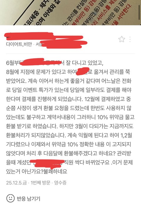 (책임감량제라 단순 마사지가 아니라 식단관리까지 해주는 곳이에요)계시던 관리 원장님, 부원장님 직원도 다 좋아서 계속 다니고 있었고, 다니던 지점A에 문제가 생겨 다른 지점B 으로 옮기게 되었습니다.해당 A지점 선생님들도 다 같이 가게 되어 거리가 조금 멀어지는거말곤 괜찮다 생각하여 계속 다니고 있었고,9월중순 부터는 일을 하게되어 (요식업) 일주일에 1회밖에 갈 수 없는 상황이었는데, 그래도 일주일에 1회라도 계속 다니고 싶어 B지점 원장님께 사정을 말씀 드렸더니 등록했던 회원권 6회를 두달이라는 기간을 주셔서 감사한 마음으로 계속 12월까지 쭉 다니고 있었습니다.