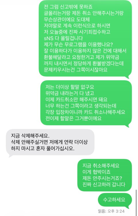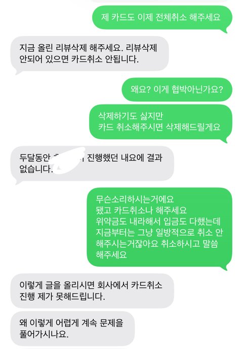 ★해당 지점에 영수증 리뷰> 올렸더니 바로 연락오네요리뷰 안지우면 카드 취소 안해준다고 ㅋㅋㅋㅋ이게 협박아닌가요?