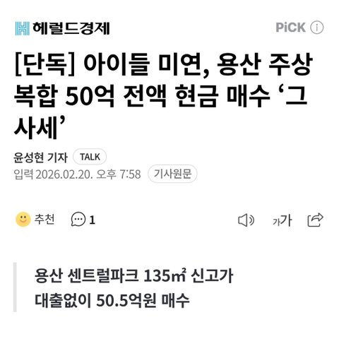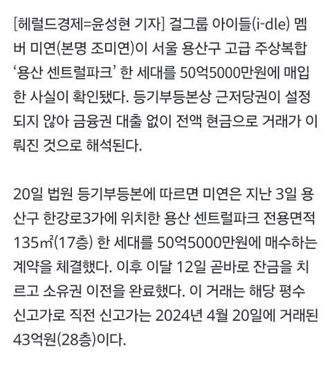아이들 미연 50억 전액 현금으로 아파트 샀대