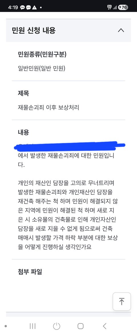 10. 해당 위치에 개인 담장의 설치가 의미가 없어졌고 담장이 허물어진 상태라 매매시 발생할 가치 하락에 대한 보상을 어떻게 할 지 물어보니 민원자체를 종결처리 시킴.