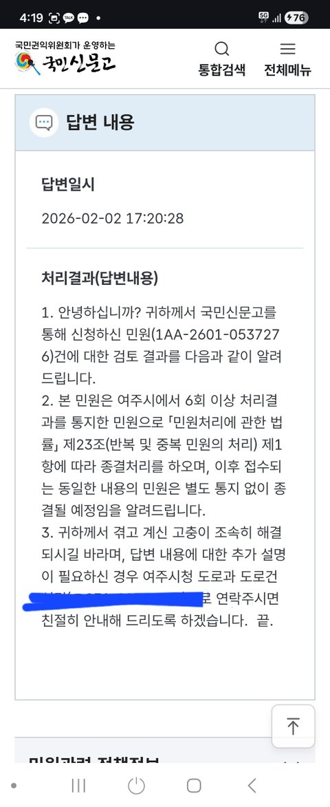 3. 해당 위치에 다른 공사를 해야하는데 이 민원 때문에 시작을 못하게 돼서 참고 넘어가달라 연락옴.