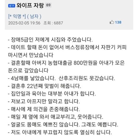 그냥 본인 희망사항 나열한 노총각 주작 글. 장애 5급인 자기한테 시집와서 돈도 벌어주고 자식도 넷이나 낳아서 살림 육아도 잘하는 아내 있다고 자랑하고 싶은데 현실은 시궁창이겠지 ㅉㅉ 자판기커피에서 뿜는다 ㅋㅋ