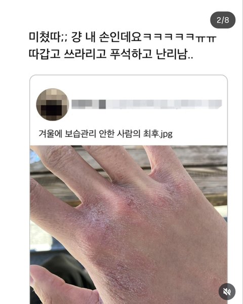 저정도로 틀때까지 놔둔게 신기;;; 핸드크림을 어케 안바를수가있지? 다이소만 가도 살수있는데? 사진 처음에 AI인줄