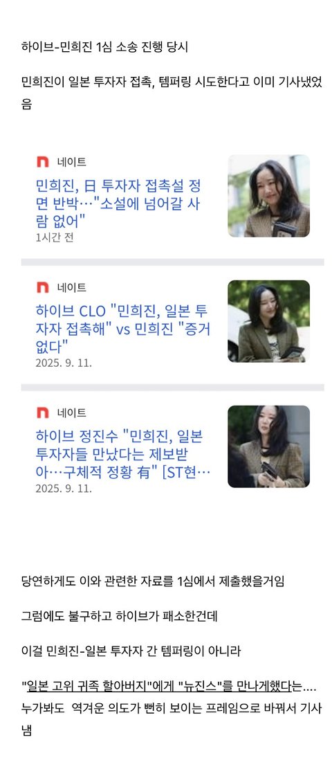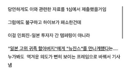 민희진 보고는 법정에서 주장 하라매 너희들도 법정에서 주장 하면됨 ㅇㅋ? 더이상 언론에 이렇다 저렇다 말할 필요 없다