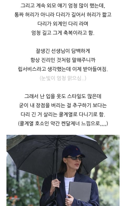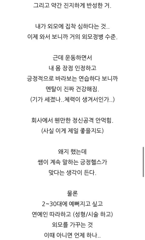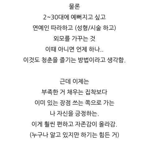 진짜 요즘 시대에 꼭 필요한 마인드인 듯.. 나도 내 몸 너무 미워하지 말고 장점을 살리기만 해도 만족하는 노력을 해봐야지 이거 보고 힘냈으면 좋겠어! 다들 외모정병 탈출하고 행복합시당