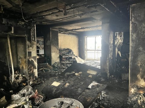 이날 소방 당국이 공개한 집 베란다 사진에는 불에 타다 만 책들이 널브러져 있었다.