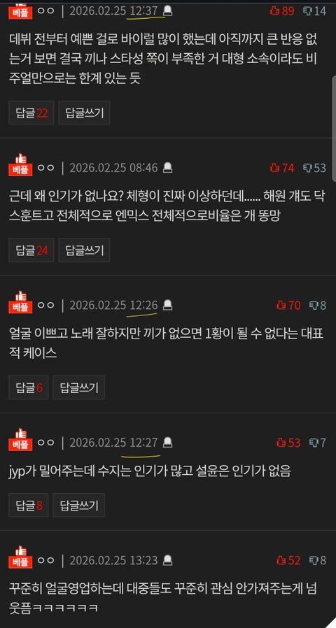 데뷔 전부터 예쁜 걸로 바이럴 많이 했는데 아직까지 큰 반응 없는거 보면 결국 끼나 스타성 쪽이 부족한 거 대형 소속이라도 비주얼만으로는 한계 있는 듯