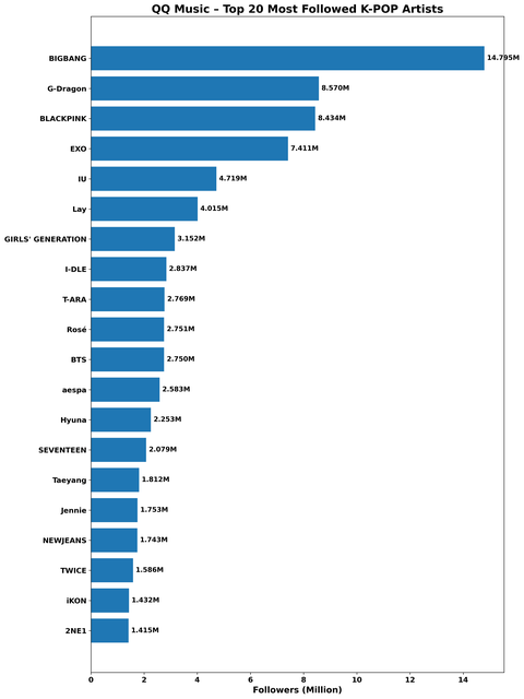 스포티파이랑 비교하면 숫자가 작아 보일 수 있는데 QQ뮤직이나 다른 중국 플랫폼은 스포티파이처럼 무료로 계정 무한 생성해서 무한 스트리밍 하는 구조가 아님..QQ뮤직은 기본적으로 유료고, 휴대폰 번호로만 가입 가능함..계정 여러 개 만드는 것도 거의 불가능하고, 중국 밖에서는 아티스트 팔로우도 안 됨 그래서 단순 숫자 비교는 의미 없다고 봄