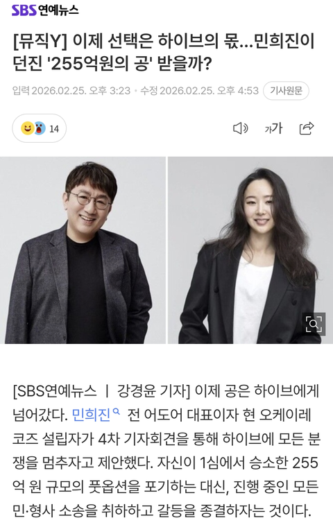 뉴진스가 걱정되어서 풋옵션을 포기할거면 진작 풋옵션 포기하고 애들을 건드리지 말았어야되는건데. 이제와서 무슨 말도 안되는 소리. 진짜 화가나서 남긴다. 끝까지 가야됩니다.