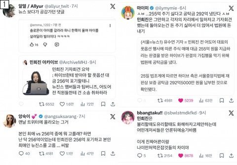 머글들이 이용하는 유튜브,인스타는 그냥 민희진이 승소한 날부터 민희진 뉴진스편으로 여론 돌아선거같고 여초, 트위터도 당연히 민희진 뉴진스편으로 여론 돌아섬