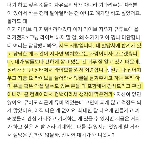 또 단편만 올리고 욕하네 컴백앞두고 뭔가 답답한 심경이 있었고 스트레스가 심했음 아미들한테 고맙다고 아미위해서 노래하고 춤춘다고 가장 중요한거 말하고 두서없이 끝난 라이브였는데 일부만 캡쳐해서 까질 그만해