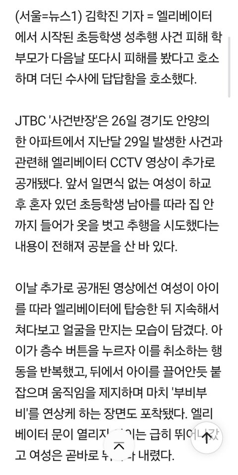 남학생 따라와 옷 벗고 추행한 여성 엘베서도 '포옹'학부모 "많이 울었다"[영상]