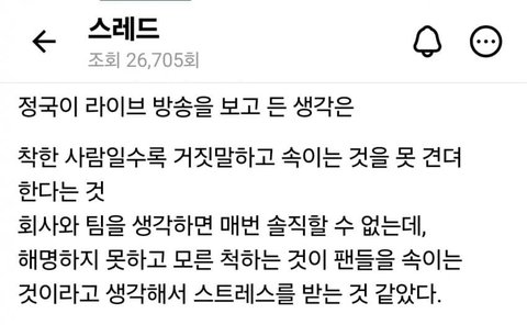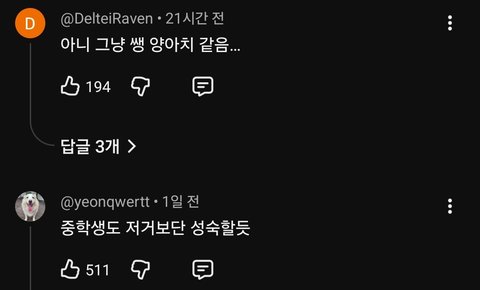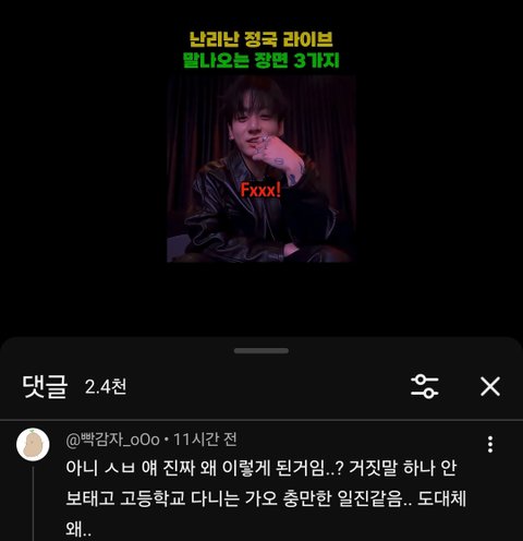 유튜브 쇼츠에 댓글은 어떤 영상이냐에 따라 아예 내용이나 분위기가 다른데 저건 자극적으로 잘라서 올린 부정적인 쇼츠 댓글인거고 긍정적인 라방 쇼츠에는 다 선플인데 이런걸로 무슨 선동질이야 할 짓 조카 없네 ㅋㅋㅋㅋㅋ 스레드나 영상 처음부터 끝까지 본 머글들은 오히려 정국을 이렇게 보더라