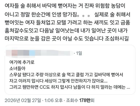 가끔 길에서 뻗거나 인사불성될정도로 술마시는 여자들 있던데 남자가 저러고 있어도 위험하다는 생각부터 드는데 무슨 생각인지 궁금하긔 분인은 괜찮을거라고 생각하는건가