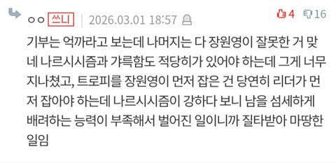 와 저글 쓰니 워딩 하나하나가 주옥같다 ㅋㅋㅋ 트로피는 당연히 리더가 먼저 잡아야하는데 장원영이 먼저 잡은게 문제고 그 원인이 장원영 나르시시즘이 심해서래 ㅋㅋㅋㅋㅋㅋㅋㅋㅋㅋㅋㅋ 저정도면 걍 정신병이여