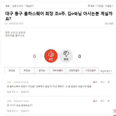 대구 동구 율하스퀘어 회장 조o주, 김o숙님 아시는분 계실까요?