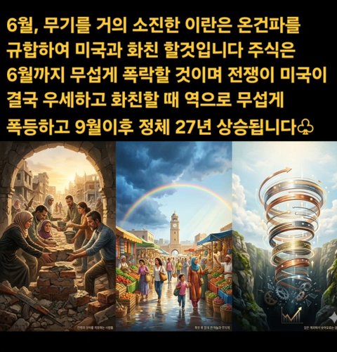 6월, 무기를 거의 소진한 이란은 온건파를 규합하여 미국과 화친 할것입니다 주식은 6월까지 무섭게 폭락할 것이며 전쟁이 미국이 결국 우세하고 화친할 때 역으로 무섭게 폭등하고 9월이후 정체 27년 상승됩니다