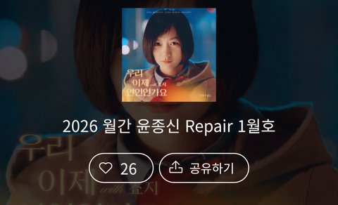 2026 [월간 윤종신] Repair 1월호 우리 이제 연인인가요는 이제 막 사랑을 시작한 연인의 설렘을 담은 곡이다. 혼자일 땐 지극히 평범했던 일상이 어떻게 둘이 되면서 특별해지는지, 사랑으로 인해 존재의 이유와 삶의 목적이 어떻게 변화하는지 표현한다. 생활의 풍경이 달라짐에 따라 서로의 결핍이 채워지는지는 순간을 포착하고, 그와 동시에 일상을 낯설고 특별한 장면으로, 인생을 한 편의 영화로 뒤바꿔놓는 사랑의 힘을 이야기한다. 원곡은 2003년에 개봉한 영화 [봄날의 곰을 좋아하세요?]의 OST로, 윤종신은 이 영화에 음악 감독이자 배우로 참여한 바 있다. 이번 리페어곡은 90년대의 감성을 섬세하고 세련되게 재해석해 온 죠지가 불렀다. 죠지는 2024년 EP [gimbap]을 통해 윤종신이 작사, 작곡한 처음 보는 나를 리메이크하기도 했다.