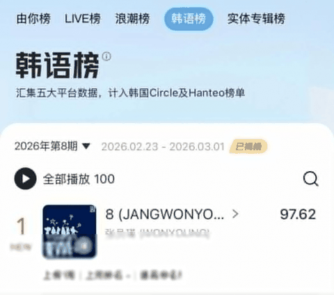 중국 QQ 뮤직 주간차트 1위