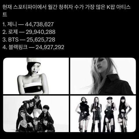 현재 스포티 월간 청취자 k팝 가수 순위 ㄷㄷ