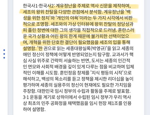 내 고1 때 생기부인데 이 때는 모든 수행평가를 챗지피티가 하라는대로만 할 때여서 그냥 복붙 했는데 한달전에 왕사남 보고 한달동안 박지훈님한테서 못 헤어나오고 있다가 개학하고 생기부 봤는데 현타 ㅈㄴ 옴 ㅠㅠ 세조의 왕위 찬탈의 정당성…??.?.?! 진짜 웃기고 있다.. 한국사 안 챙겨서 계유정난이 뭔지도 모르고 있다가 왕사남 계기로 계유정난 알아서 내가 계유정난에 대해 수행 봤다는 것도 지금 알았네..,, 저기서 말하는 어린 왕이 단종인거잔아…!.!!!! ㅠㅠ ‘개혁을 위한 단호한 결단‘ 이런다 진짜…. 이게 엄청 떠서 소속사가 보고 연락 줘서 박지훈이랑 만났으면 좋겟다.. 진심 박지훈님이랑 결혼하고 싶어요…