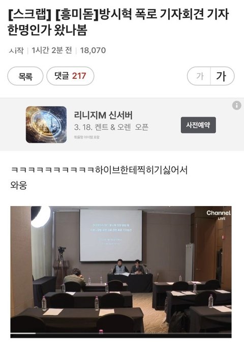 사진 보고 충격 받았음 ㄹㅇ... 역대 최고 수준 주가조작 논란의 녹취까지 있는 기자회견이었는데.....민희진이랑 뉴진스한테 기자들이 제목으로 어떤 공격을 했는지 생각나는데 지금 저건 기사도 제대로 안 나