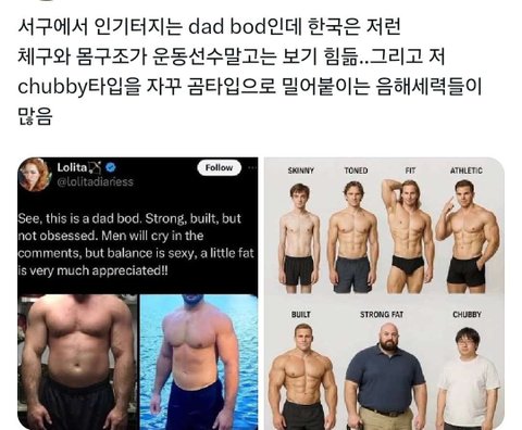 쟤들도 저런 장사체형이 귀해서 뜨는거야. 반대로 드라마 보고 한국남자들 전부 잘생겼다는 악귀들 보면 뭔 생각 들어? 지능이 낮은가 싶지? 내가 보는 니가 꼭 그래. 그리고 저런 곰체형 좋아하면 씨름, 레슬링, 역도 파라. 꽤 많다. 단 얼굴은 포기해라.