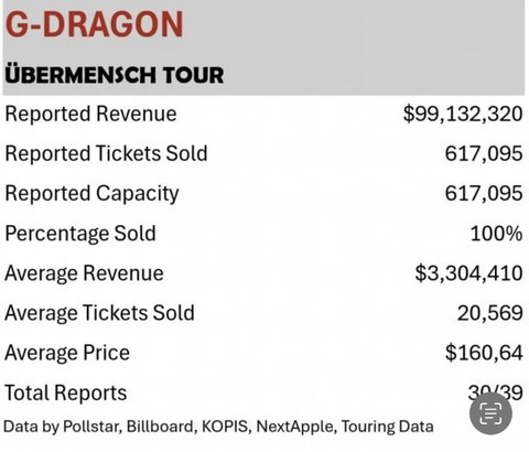 지디 작년 투어 매출 총 39회중 30회만 반영된 수익만봐도 1464억으로 역대솔투1위임 ㅋㅋㅋㅋ회당 평균매출도 약 49억으로 1위 나머지 9회도 포함하면 최소 1800억대인데 정병들 날조자료로 내려치는거ㅈㄴ웃김 저 4200억이 어디서 나왔겠냐