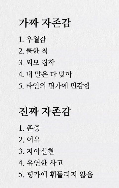 진짜 자존감 높은 사람들은, 예쁜거 보면 예쁘다, 남 축하할 일 생기면 축하단다 순수한 그대로 애기할 줄 앎. 사람 봐도 칭찬할거 있음 잘하고 , 단점보다는 장점 위주로 먼저 봄/ 그리고 남에게 피해주지 않는 선에선 본인 입고싶은거나 취향 이런거 시선 신경 안씀