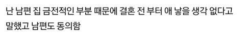 난 남편 집 금전적인 부분 때문에 결혼 전 부터 애 낳을 생각 없다고 말했고 남편도 동의함