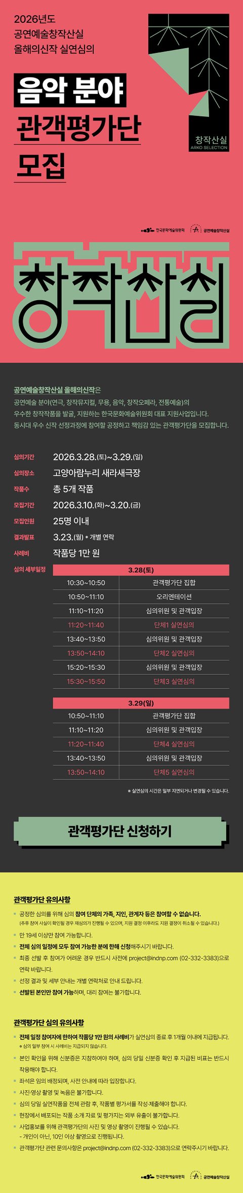 [음악분야] 관객평가단 신청하기 : https://forms.gle/TQx3i5S3xxm4Jk6i7