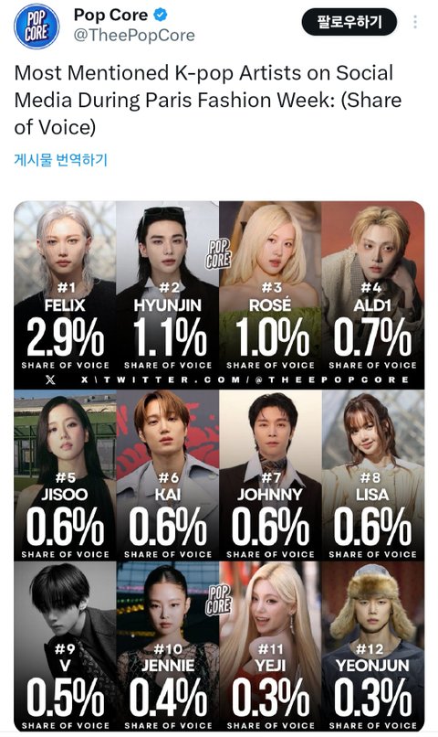 파리 패션 위크 가장 많이 언급된 K-POP 가수