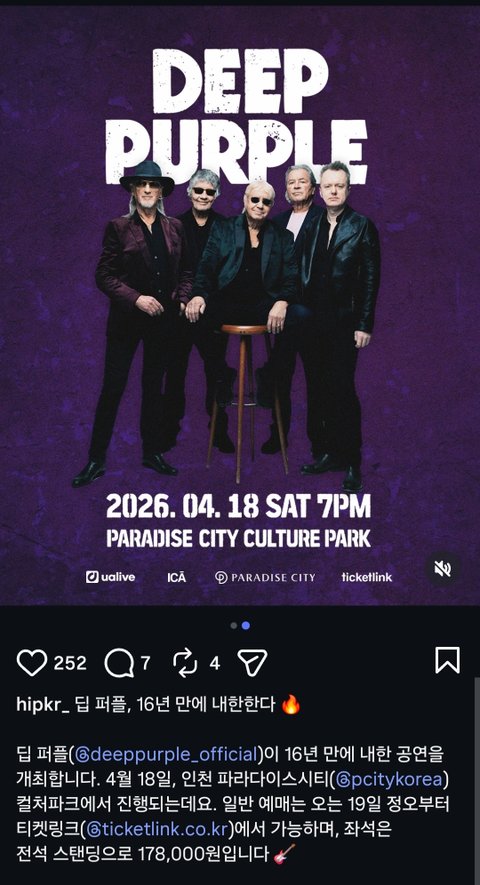 4월 18일에 딥퍼플 내한공연 한다네요
